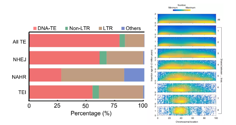 水稻中TEs,尤其是LTRs促進(jìn)非等位同源重組(Qin P et al.,Cell.2021);玉米泛基因組中隨著個體的增加,LTR插入呈現(xiàn)向中心富集,并與插入時間的增加相關(guān)。