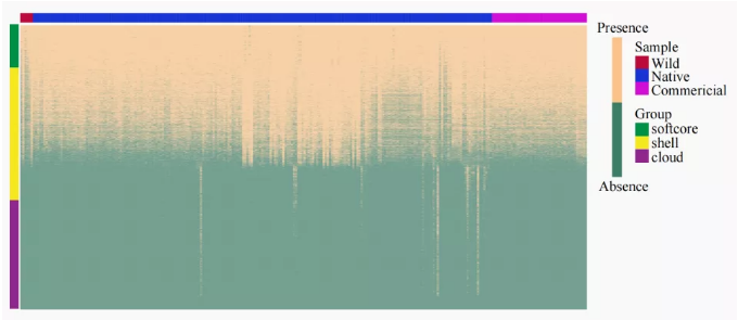 除此之外,根據(jù)core、dispensable等各組分聚類結(jié)果構(gòu)建基因家族的存在與缺失分布熱圖,進(jìn)一步了解不同材料中的差異情況。同時可結(jié)合不同來源or不同表型等特征充分挖掘其基因型的多態(tài)性。