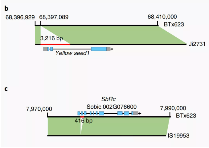 例如高粱泛基因組研究發(fā)現(xiàn),相對于參考基因組,其它高粱個體基因組中有429~1118個基因存在拷貝數(shù)變異(CNV)。功能注釋顯示這些CNV基因豐富了防御反應(yīng)、信號轉(zhuǎn)導(dǎo)和細(xì)胞蛋白分解代謝等生物學(xué)過程。并且不同高粱個體基因組上存在大量的存在缺失變異(PAV),有2514個基因受PAV嚴(yán)重影響,這些基因富集于與生物和非生物脅迫相關(guān)的生物過程,而抗病基因在這組基因中顯著富集。進(jìn)一步研究發(fā)現(xiàn)Yellow seed1、SbRc的PAV影響到高粱籽粒顏色變化(圖9)