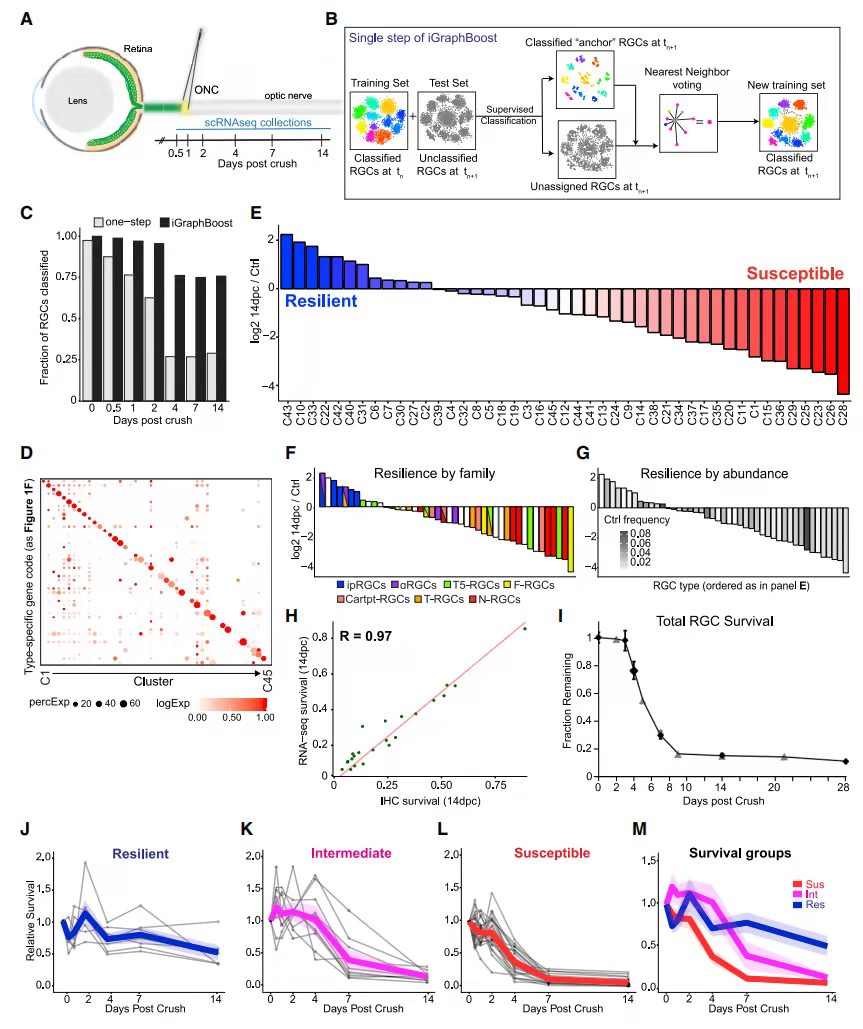 以RGC圖譜為基礎(chǔ),評(píng)估了不同細(xì)胞類型對(duì)ONC的彈性(圖 3A)。在ONC后14天對(duì)~8,500個(gè)RGC進(jìn)行分析,此時(shí)~80% RGC已經(jīng)死亡(圖 3C),該研究使用iGraphBoost對(duì)細(xì)胞進(jìn)行分群(圖 3B),iGraphBoost可以將89%損傷的RGC分配到各個(gè)cluster中(圖 3C)。損傷后第14天所有cluster表達(dá)的marker基因同1F(圖3D)。與對(duì)照相比,將14dpc不同RGC類型的存活率按從高到低排列(圖 3E),不同RGC類型在14dpc時(shí)表現(xiàn)出不同的存活率,范圍從1%到98%不等。比較轉(zhuǎn)錄組測序和IHC對(duì)細(xì)胞活率的結(jié)果,結(jié)果高度一致(Pearson r = 0.97)(圖 3H)。這些數(shù)據(jù)表明不同RGC對(duì)傷害的不同反應(yīng)。所有ipRGC(Opn4+)都是有彈性的,所有N-RGC類型都是易受影響的(圖 3F)。之前被定性為彈性子類的aRGC中,C42,43具有很高的彈性,但C41,45相對(duì)容易受到影響(圖 3F)。同樣,稀有和豐富的類型都可能具有彈性或脆弱性(圖 3G)。因此,基因表達(dá)或RGC子類都不是判斷細(xì)胞是否是彈性的完美因子。