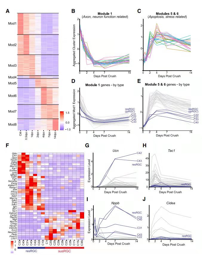 為了研究RGC中激活損傷反應(yīng),對(duì)ONC后的RGC進(jìn)行基因表達(dá)譜分析,確定了771個(gè)在不同類型之間的DE基因,通過k均值聚類(圖 4A)劃分為8個(gè)模塊(Mod1-8),識(shí)別具有不同時(shí)間動(dòng)態(tài)的基因集,這些基因集富集在不同的GO功能中,例如在0.5dpc開始下降的模塊1(Mod1)中的基因富集在健康神經(jīng)元相關(guān)的GO功能中,如動(dòng)作電位、突觸囊泡胞外/內(nèi)吞作用和逆行軸突運(yùn)輸(圖 4B)。相比之下,在Mod5和Mod6中的基因與細(xì)胞凋亡和應(yīng)激途徑相關(guān)(圖 4C)。DE基因幾乎沒有表現(xiàn)出強(qiáng)烈的類型特異性差異,但ipRGC類型除外,Mod5、6和7中C22、C31、C33和C40中的基因的上調(diào)明顯低于其他類型(圖 4D和4E)。