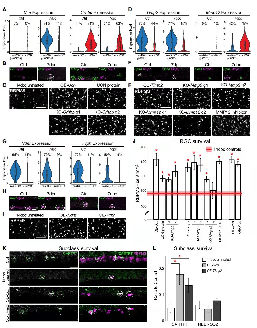 尿皮質(zhì)素(Ucn),它編碼來自促腎上腺皮質(zhì)激素釋放因子家族的肽;促腎上腺皮質(zhì)激素釋放激素結(jié)合蛋白(Crhbp)。ONC后Ucn僅在aRGC中上調(diào),而Crhbp在ONC前后susRGC中表達(dá)(圖 5A和5B)。過表達(dá)Ucn,注射Ucn重組蛋白,通過CRISPR和兩種不同的sgRNA敲除Crhbp,結(jié)果發(fā)現(xiàn)四種方式都顯著增加RGC的存活率(圖 5C和5J)。隨后又驗(yàn)證了幾對(duì)基因的表達(dá)和功能富集情況,結(jié)果與Ucn和Crhbp類似。說明可以通過對(duì)基因的干預(yù)來保護(hù)部分脆弱的RGC類型。