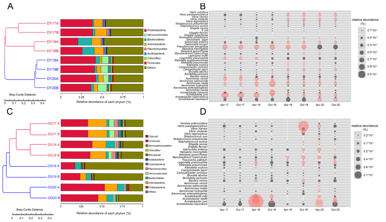 A:DY細(xì)菌群落相對豐度;B:DG中細(xì)菌群落相對豐度;C:DY樣品中細(xì)菌病原體的動(dòng)態(tài);D:DG樣品中細(xì)菌病原體的動(dòng)態(tài)