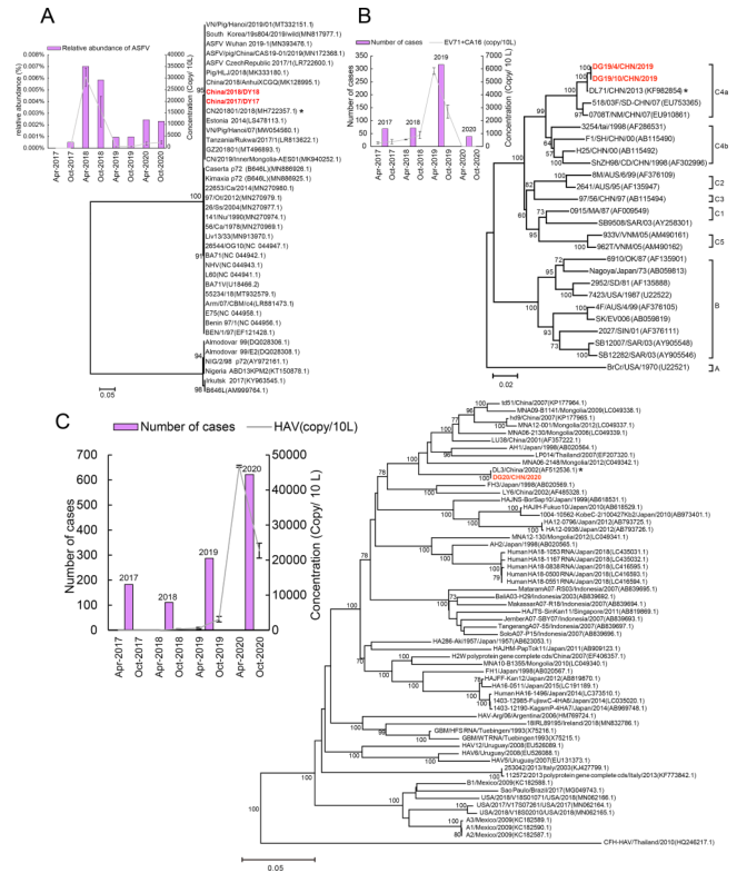 在DY發(fā)現(xiàn)了非洲豬瘟病毒(ASFV)和豬痘病毒(Swinpox Virus)等幾種病毒。ASFV在2017年10月被檢測到,并在2018年達(dá)到頂峰(圖6A),并通過qPCR證實(shí)。qPCR在2018年4月后連續(xù)檢測到ASFV,其中2018年4月的病毒載量為3.0×103拷貝/L。在DG地點(diǎn)未檢測到ASFV和Swinpox病毒,在兩個(gè)地點(diǎn)均未檢測到其它人畜共患病DNA病毒。通過高通量微流控芯片檢測檢測了40種致病性RNA病毒的存在。DY樣品中,經(jīng)qPCR確認(rèn),2019年僅檢測到諾如病毒、流行性腮腺炎病毒、鼻病毒和Human herpesvirus 6病毒。DG樣品中,2017年至2019年在樣本中檢測到human enterovirus 71 (EV71),2020年4月檢測到Coxsackievirus 16 (CA16)。
