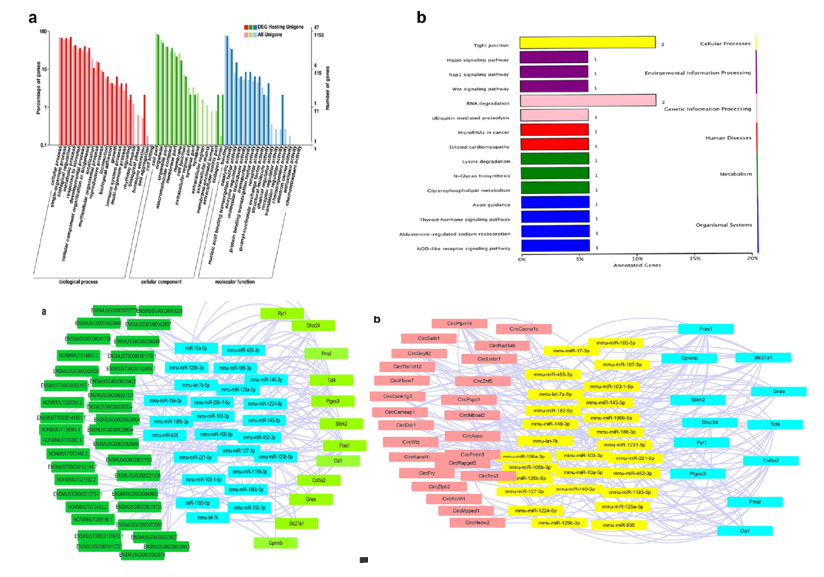 2. 差異非編碼RNA靶基因預(yù)測:GO term和pathway分析差異表達(dá)miRNA、lncRNA的靶基因以及circRNA的宿主基因,結(jié)果顯示circRNA的宿主基因主要富集在細(xì)胞過程和單個(gè)生物體過程中;miRNA的靶基因主要富集于染色質(zhì)結(jié)合和核內(nèi)鈣離子結(jié)合;lncRNA相關(guān)基因的功能是翻譯后修飾。