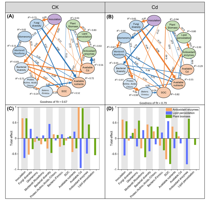 與細菌群落相反,VPA顯示真菌群落對土壤變量的影響較小(圖4A和B),這與我們的結(jié)果一致,即除Olsen-P和pH值外,真菌群落與根際中的SOC和養(yǎng)分沒有很強的相關(guān)性(圖4C)。我們的結(jié)果表明,真菌群落在提高紫花苜??笴d脅迫方面的相關(guān)效果低于細菌群落。這些結(jié)果也被發(fā)現(xiàn)的關(guān)鍵真菌類群和根際變量之間的微弱相關(guān)性所支持(圖4E)。但是,由AMF接種引起的這些關(guān)鍵真菌類群的變化強烈影響了關(guān)鍵細菌類群,這表明這些關(guān)鍵真菌類群可能通過影響細菌群落的方式在Cd脅迫下輔助苜蓿生長中發(fā)揮間接作用。這些結(jié)果也闡明了根瘤菌和AMF共同接種與單獨接種相比促進苜??剐院蜕L的原因。通過PLS-PM分析(圖5),關(guān)鍵的真菌類群對關(guān)鍵的細菌類群有直接影響,這對植物的抗性和生長有間接的有利影響。一般來說,在根瘤菌和AMF共同接種處理下,根瘤菌群落而非相應(yīng)的真菌群落主要提高了紫花苜蓿對Cd脅迫的抗性。