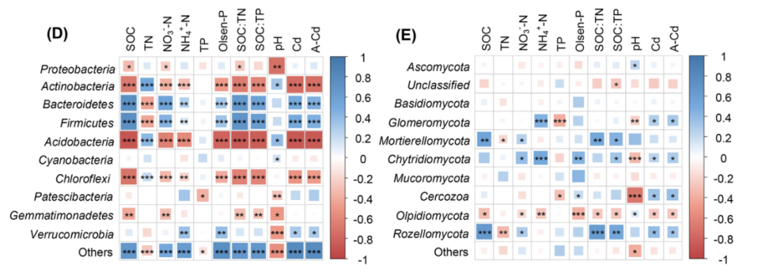 圖4 變異分區(qū)分析顯示了細菌(A)和真菌(B)群落解釋的土壤特性和土壤Cd的差異百分比。土壤變量與微生物群落結(jié)構(gòu)之間的關(guān)系(C)。細菌類群(門水平,D)和真菌類群(門水平,E)與土壤特性的相關(guān)熱圖。