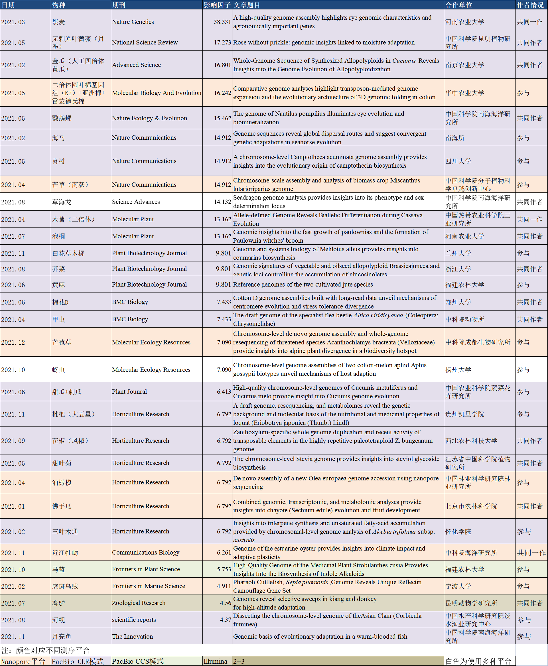 百邁客2021年動(dòng)植物基因組成功案例列表
