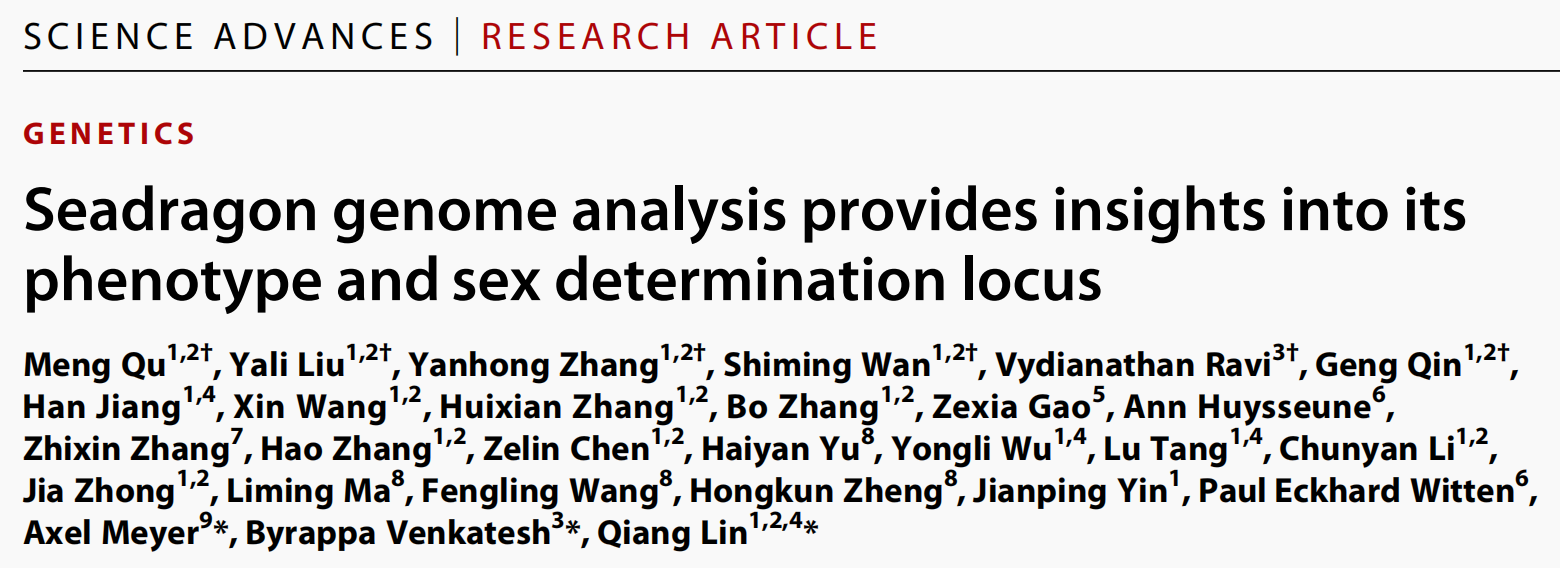本研究完成雌雄性海龍基因組的破譯,草海龍最終組裝大小為 ~659 Mb(♂)與 ~663 Mb(♀), contig N50分別為10.0 Mb與12.1 Mb。綠海龍分別組裝~637 Mb(♂)與~648 Mb(♀),contig N50分別為18.0Mb與21.0 Mb。通過(guò)系統(tǒng)發(fā)育分析,明確草海龍與綠海龍?jiān)谙到y(tǒng)發(fā)育地位上屬于海龍亞科(Syngnathinae)的姊妹群,并于27.3 百萬(wàn)年前左右發(fā)生分化。進(jìn)一步通過(guò)結(jié)合重測(cè)序分析、轉(zhuǎn)錄分析、比較基因組分析等研究揭示了草海龍適應(yīng)性進(jìn)化產(chǎn)物附葉的快速愈合和再生能力相關(guān)基因,以及海龍科物種性別決定基因的產(chǎn)生和演化歷程,為海洋魚(yú)類(lèi)的環(huán)境適應(yīng)性進(jìn)化研究提供了重要理論依據(jù)。