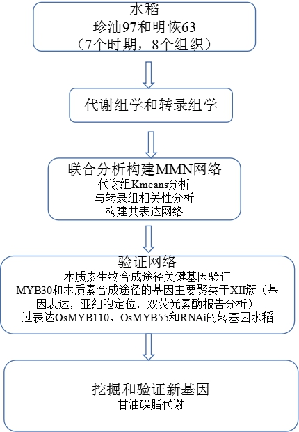 該研究利用代謝組和轉(zhuǎn)錄組聯(lián)合分析,對秈稻品種珍汕97和明恢63整個生命周期不同組織的樣品進(jìn)行測定,結(jié)合轉(zhuǎn)錄和代謝數(shù)據(jù)構(gòu)建了水稻全生育期主要組織器官的代謝調(diào)控網(wǎng)絡(luò)(RMRN)并精準(zhǔn)識別了調(diào)節(jié)關(guān)鍵代謝產(chǎn)物積累的調(diào)控基因,利用已知的轉(zhuǎn)錄因子作為誘餌來篩選木質(zhì)素代謝新的調(diào)控網(wǎng)絡(luò),以及根據(jù)組織特異性無偏見地識別新的甘油磷脂代謝調(diào)控因子。該研究不僅對水稻基礎(chǔ)研究和育種實(shí)踐具有重要意義,大數(shù)據(jù)資源促進(jìn)水稻生長調(diào)控、抗性和營養(yǎng)品質(zhì)方面的改良研究。并對其他作物全生育期代謝組學(xué)研究提供借鑒。