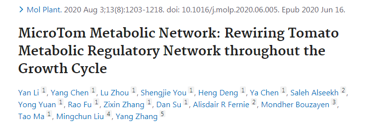[1] Li Y, et al. MicroTom Metabolic Network: Rewiring Tomato Metabolic Regulatory Network throughout the Growth Cycle. Mol Plant. 2020 Aug 3;13(8):1203-1218. doi: 10.1016/j.molp.2020.06.005. Epub 2020 Jun 16. PMID: 32561360