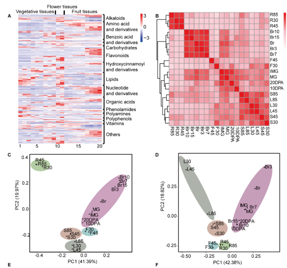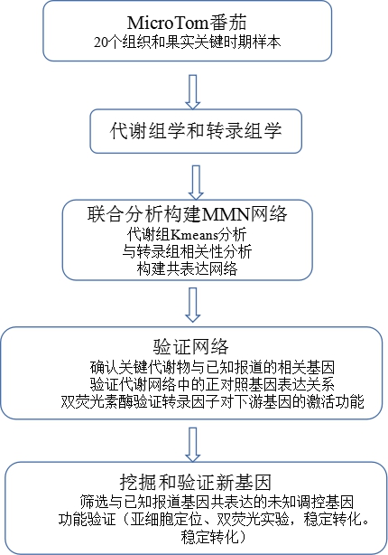 利用番茄代謝組和轉(zhuǎn)錄組數(shù)據(jù)集,通過整合番茄20個組織和發(fā)育時期的代謝組和轉(zhuǎn)錄組數(shù)據(jù),繪制了番茄整個生長發(fā)育過程中主要代謝變化的整體圖譜,同時還發(fā)現(xiàn)調(diào)節(jié)重要次級代謝產(chǎn)物(類黃酮和甾體類生物堿)合成的關(guān)鍵調(diào)控因子,為深入解析番茄主要代謝物的轉(zhuǎn)錄調(diào)控網(wǎng)絡(luò)奠定了基礎(chǔ),并為模式和非模式植物代謝調(diào)控的深入研究提供了新思路。