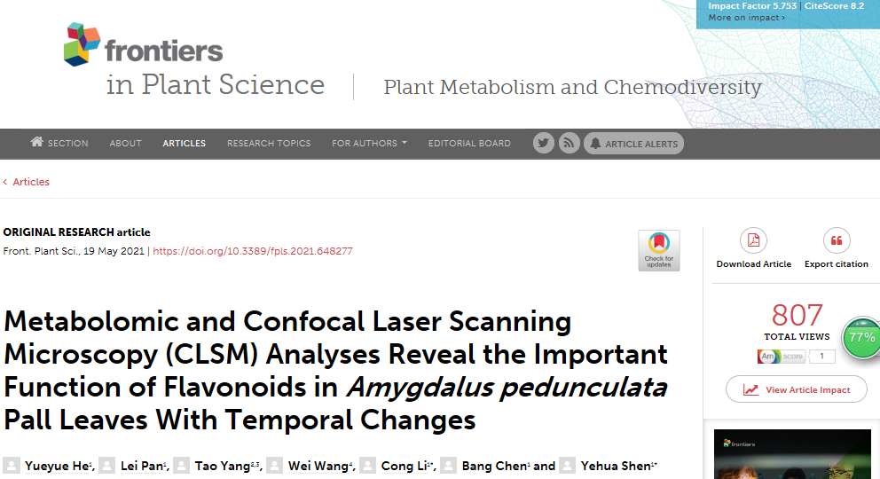 中文題目:代謝組學(xué)和激光共聚焦顯微鏡(CLSM)分析揭示長柄扁桃葉生長過程中黃酮類化合物的重要作用