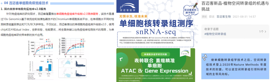 百邁客是國(guó)內(nèi)首批引進(jìn)10x genomics單細(xì)胞測(cè)序平臺(tái),在國(guó)內(nèi)展開高通量單細(xì)胞測(cè)序服務(wù)。目前累計(jì)成功制備200余種組織類型、5000+例的樣本,覆蓋的物種和樣品類型包括人和小鼠的腦組織、肺臟、皮膚、視網(wǎng)膜、腎臟、脾臟、小腸,以及斑馬魚、擬南芥、水稻等。為了幫助更多老師開展單細(xì)胞空間多組學(xué)研究領(lǐng)域,資深單細(xì)胞技術(shù)團(tuán)隊(duì)在百邁客醫(yī)學(xué)微信公眾號(hào)創(chuàng)辦了百邁客單細(xì)胞 & 空間轉(zhuǎn)錄組專題欄目系列,可提供專業(yè)的課題方案設(shè)計(jì)、案例分享、數(shù)據(jù)分析和時(shí)空多維解決方案,同時(shí)含有發(fā)文思路、分析技巧、項(xiàng)目經(jīng)驗(yàn)等應(yīng)有盡有,百邁客人在過(guò)去的一年只為給您專業(yè)優(yōu)質(zhì)的單細(xì)胞&空間轉(zhuǎn)錄組系列服務(wù)!