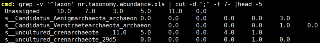 grep -v ‘^Taxon’ nr.taxonomy.abundance.xls | cut -d “;” -f 7- |head -5 #從中篩選種級別的注釋結(jié)果,并展示前5行。