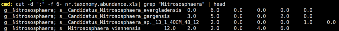 cut -d “;” -f 6- nr.taxonomy.abundance.xls| grep “Nitrososphaera” | head #從中篩選”Nitrososphaera”屬的注釋結(jié)果,并展示前5行。