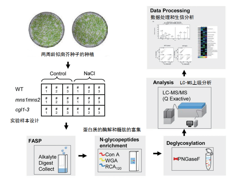 在植物中,N-糖基化參與許多生物過(guò)程,包括類(lèi)固醇激素受體的?ER?質(zhì)量控制、配子體識(shí)別,?亞細(xì)胞轉(zhuǎn)運(yùn),?植物先天免疫?和氣孔發(fā)育等,主要是通過(guò)調(diào)節(jié)底物蛋白的穩(wěn)定性、功能或亞定位實(shí)現(xiàn)調(diào)控過(guò)程。此外研究發(fā)現(xiàn)復(fù)雜的N-聚糖生物合成失敗會(huì)導(dǎo)致擬南芥幼苗對(duì)鹽敏感,但對(duì)其潛在的分子機(jī)制仍知之甚少。本文利用納升流液相色譜串聯(lián)質(zhì)譜?(nanoLC-MS/MS)?技術(shù)進(jìn)行了無(wú)標(biāo)記蛋白質(zhì)組學(xué)分析,比較分析了野生型?(WT)?和兩個(gè)抗鹽脅迫的突變體的蛋白質(zhì)組差異。
