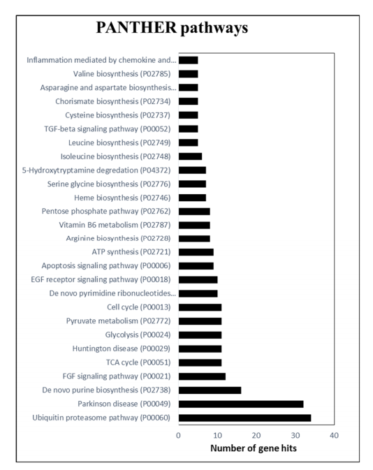 統(tǒng)計(jì)分析后,作者進(jìn)行基于基因本體(GO)的功能分類(lèi),在2102種蛋白質(zhì)中,PANTHER?19.0?針對(duì)Helianthus?annus數(shù)據(jù)庫(kù)檢測(cè)到2044種蛋白質(zhì)。接下來(lái),進(jìn)行?PANTHER?通路分析以對(duì)蛋白質(zhì)通路進(jìn)行分類(lèi),發(fā)現(xiàn)了大多數(shù)蛋白質(zhì)歸因于泛素蛋白體和核苷酸(嘌呤)生物合成途徑,其次是TCA循環(huán)、糖酵解、丙酮酸代謝、細(xì)胞周期和嘧啶核糖核苷酸途徑。
