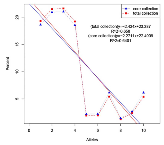 構(gòu)建好的核心種質(zhì)采用何種方法去評估核心樣品對整個(gè)種質(zhì)資源多樣性的代表性同樣是核心種質(zhì)研究中的重點(diǎn)。目前,大多數(shù)研究者結(jié)合不同的方法對核心種質(zhì)進(jìn)行評估驗(yàn)證,通過對原始種質(zhì)材料和篩選的核心種質(zhì)材料進(jìn)行主成分分析,評估種質(zhì)篩選的準(zhǔn)確性,原則上,基于核心種質(zhì)繪制的主成分圖和所有材料的分布圖趨勢吻合,就能說明篩選結(jié)果的合理性;計(jì)算常規(guī)的遺傳多樣性指標(biāo):觀測雜合度(Observed?heterozygosity)、期望雜合度(Expected?heterozygosity)、Nei遺傳多樣性(Nei?diversity?index)、香濃維納多樣性指數(shù)(Shanon-Wiener?index)、多態(tài)性信息含量(PIC),對原始種質(zhì)材料以及篩選的核心種質(zhì)的遺傳多樣性進(jìn)行評價(jià);另外還包括等位基因評價(jià)和表型評價(jià)。