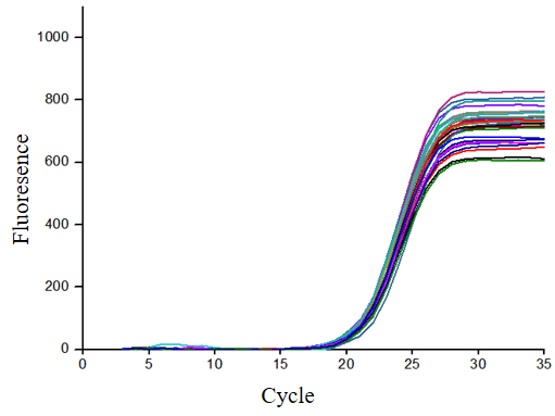2.重復(fù)性檢測(cè):分別設(shè)置30個(gè)復(fù)孔,擴(kuò)增相同的基因,發(fā)現(xiàn)擴(kuò)增曲線(xiàn)的Ct值幾乎一致。