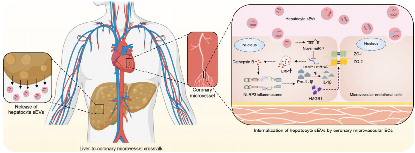 在本研究中,作者通過大量結(jié)論表明在NAFLD期間,冠狀動脈微血管發(fā)生內(nèi)皮細(xì)胞的高通透性。肝內(nèi)脂質(zhì)水平的增強(qiáng)可誘導(dǎo)富含novel-miR-7的肝臟外泌體的分泌,通過調(diào)節(jié)LAMP1/組織蛋白酶B/NLRP3炎癥小體信號通路,促進(jìn)微血管內(nèi)皮細(xì)胞的高通透性。此外,脂肪變性肝細(xì)胞是含有novel-miR-7外泌體的一個重要來源,而對novel-miR-7的基因抑制可以改善微血管內(nèi)皮屏障的完整性。本研究為肝臟-心臟間器官交流的具體機(jī)制帶來了新的見解,并證實novel-miR-7有潛力成為冠脈微血管損傷的疾病標(biāo)志物和治療靶點(diǎn)。