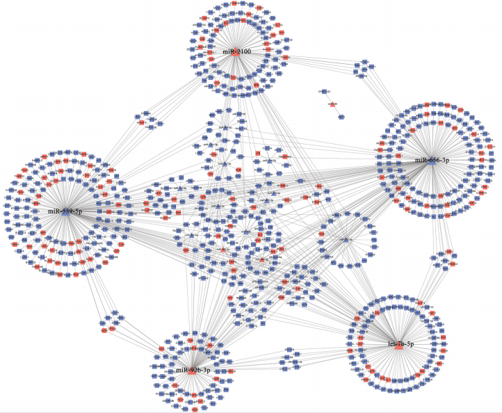 作者利用測序數(shù)據(jù)和TCGA數(shù)據(jù)集構(gòu)建了LUAD相關(guān)的miRNA-mRNA調(diào)控網(wǎng)絡(luò),鑒定了5個關(guān)鍵miRNAs和兩個關(guān)鍵mRNA。miR-539-5p,miR-656-3p、let-7b-5p、miR-2110和miR-92b-3p在LUAD腫瘤的發(fā)生和進(jìn)展中發(fā)揮重要作用。兩個關(guān)鍵mRNA,SPP1和HGF,與LUAD患者的生存相關(guān)。這些發(fā)現(xiàn)為臨床環(huán)境中的預(yù)測、預(yù)后和治療靶點提供了新的分子標(biāo)記物,并闡明了LUAD調(diào)控的新機(jī)制。