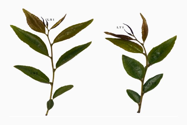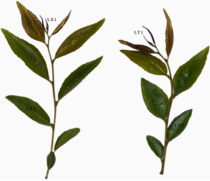 實(shí)驗(yàn)材料:本研究使用了兩個(gè)紫葉棗品種和八個(gè)綠葉棗品種。轉(zhuǎn)錄組和代謝組材料:兩個(gè)紫葉棗品種,“Sanbianhong”和“Tailihong”,?葉芽分別命名為LS1和LT1,成熟葉分別命名為LS2和LT2(圖1)
