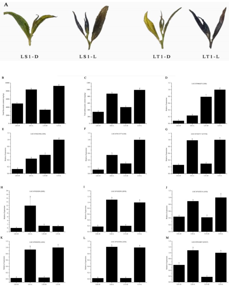 圖6暗處理?xiàng)l件(LS1-D和LT1-D)和光處理?xiàng)l件(LS1-L和LT1-L)下葉芽中類黃酮的積累。