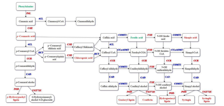 本研究采用多種生物學(xué)方法對青檸檬油斑病木質(zhì)素積累的機制進(jìn)行了分析。油斑病損傷檸檬皮的初級代謝物(尤其是葡萄糖)顯著降低,次級代謝物(尤其是木質(zhì)素)顯著增加。檸檬皮在油斑病下發(fā)生嚴(yán)重的木質(zhì)化,苯丙素的生物合成被顯著激活,與木質(zhì)素積累相關(guān)的DEGs有79個,其中65個基因顯著上調(diào),尤其是PAL、C4H、CCR、F5H POD和UGT72E基因。油斑病損害的檸檬皮具有較高水平的木質(zhì)素積累和增強對病原真菌的防御。該研究是首次報道檸檬油斑病對病原真菌表現(xiàn)出較高的抗性。