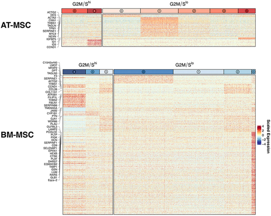 無監(jiān)督聚類分別將AT來源的MSCs、BM來源的MSCs和PBM來源的MSCs聚類為7,7,10個clusters(Fig.?4a)。根據(jù)作者最初的分析中,細(xì)胞周期相關(guān)基因的表達對聚類有很大的影響(Kowalczyk?et?al.,?2015)。在本研究中作者也觀察到一些明顯由與增殖一致的基因表達模式定義的簇(Fig.?4b),因此,作者進一步分析了G1?clusters和G2M/S?clusters,以確定不同細(xì)胞周期分類的簇間差異基因表達模式。在這種分組策略下,差異基因表達測試顯示來自AT、BM和PB衍生的MSCs中存在明顯的源內(nèi)轉(zhuǎn)錄異質(zhì)性,盡管在AT來源的MSCs中差異較小,差異表達基因?(DEGs)?以熱圖的形式進行展示?(Fig.?5)。為了檢查檢測到的clusters的假定生物學(xué)功能,作者對每個組織中的每個cluster進行了GO功能富集分析,其中BM來源的MSCs中排名最靠前的是cluster2的細(xì)胞遷移和cluster3中的慢性炎癥反應(yīng),PB來源的MSCs中排名靠前的是cluster4的蛋白組折疊和cluster6中的趨化性調(diào)節(jié),AT來源的MSCs沒有檢測到任何顯著富集的GO?terms,表明檢測到的clusters之間的轉(zhuǎn)錄差異極小。