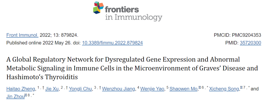 Zheng,?Haitao?et?al.?“A?Global?Regulatory?Network?for?Dysregulated?Gene?Expression?and?Abnormal?Metabolic?Signaling?in?Immune?Cells?in?the?Microenvironment?of?Graves’?Disease?and?Hashimoto’s?Thyroiditis.”?Frontiers?in?immunology?vol.?13?879824.?26?May.?2022,?doi:10.3389/fimmu.2022.879824