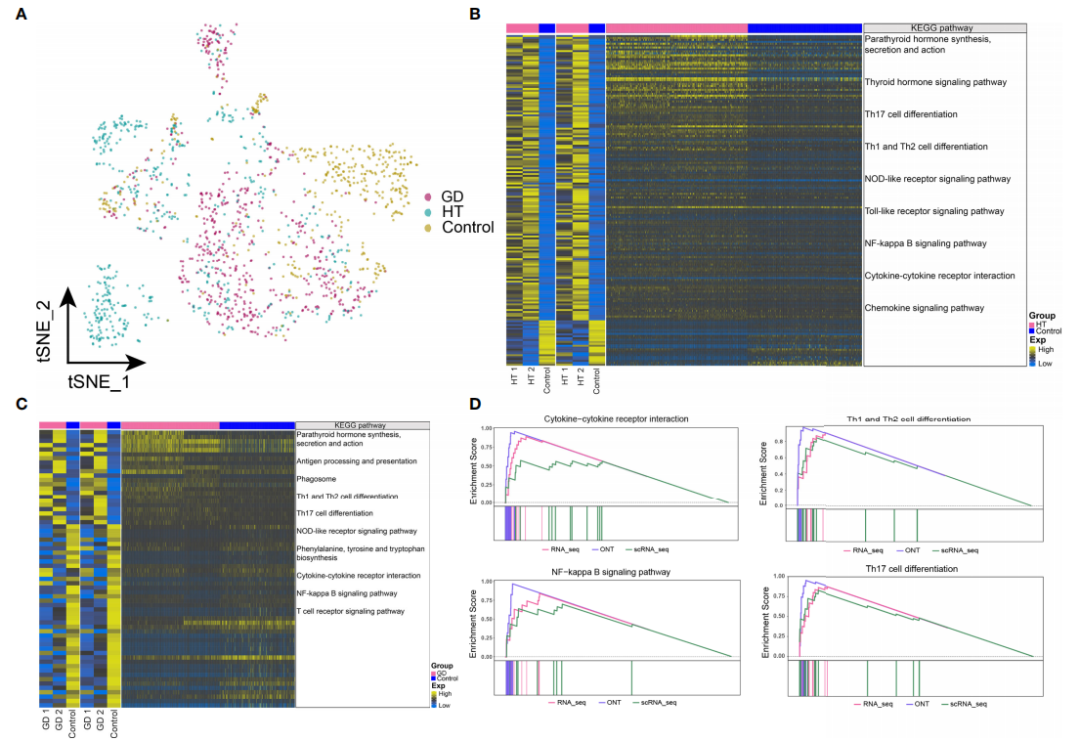 對(duì)單細(xì)胞轉(zhuǎn)錄組數(shù)據(jù)中的CD4+?T細(xì)胞亞群進(jìn)行進(jìn)一步分析,發(fā)現(xiàn)在HT、GD和對(duì)照組中細(xì)胞豐度存在明顯差異(圖?3A)。將bulk?RNA-seq數(shù)據(jù)中顯著差異表達(dá)的基因,與CD4+??T細(xì)胞的單細(xì)胞RNA-seq數(shù)據(jù)中的基因取交集,并對(duì)這些共表達(dá)的基因集進(jìn)行功能富集分析;分析結(jié)果顯示,HT組中顯著差異富集的通路有甲狀腺激素信號(hào)通路、T?細(xì)胞受體信號(hào)通路、Th1和Th2細(xì)胞分化、Th17細(xì)胞分化、細(xì)胞因子-細(xì)胞因子受體相互作用和NF-kappa?B信號(hào)通路(圖?3B);而在GD組中,甲狀旁腺激素合成,分泌和作用、ECM-受體相互作用、嘌呤代謝、cAMP?信號(hào)通路、NF-kappa?B?信號(hào)通路、細(xì)胞因子-細(xì)胞因子受體相互作用和T細(xì)胞受體信號(hào)通路顯著富集(圖?3C?)。GSEA富集分析結(jié)果顯示,HT組中細(xì)胞因子-細(xì)胞因子受體相互作用和T細(xì)胞受體信號(hào)通路顯著富集(圖?3D),但GD組中未觀察到顯著富集的通路。此外,氨基酸生物合成和嘌呤代謝相關(guān)的代謝通路在HT和GD組中均顯著富集。