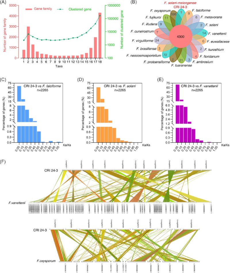 圖6 CRI 24-3與其他鐮刀菌的基因組比較分析。 (A)基因家族和聚集在相應(yīng)家族中的基因數(shù)量從1到18不等。(B)花形維恩圖。?中心值表示 18 個鐮刀菌屬中所有共有基因家族的數(shù)量;?花瓣的值表示每個物種中特有基因家族的數(shù)量。?(C 到 E)CRI 24-3 和?F. falciforme、F. solani、F. vanettenii?之間基因?qū)Φ?Ka/Ks 比率分布。?小寫字母“n”后面的值表示所有檢測到的基因?qū)Φ臄?shù)量。?(F) 顯示基因組共線性的雙同線性圖。?不同顏色的線用于連接 CRI 24-3 和?F. vanettenii?(頂部) 或?F. oxysporum?(底部) 之間的直系同源基因?qū)Α?/p>