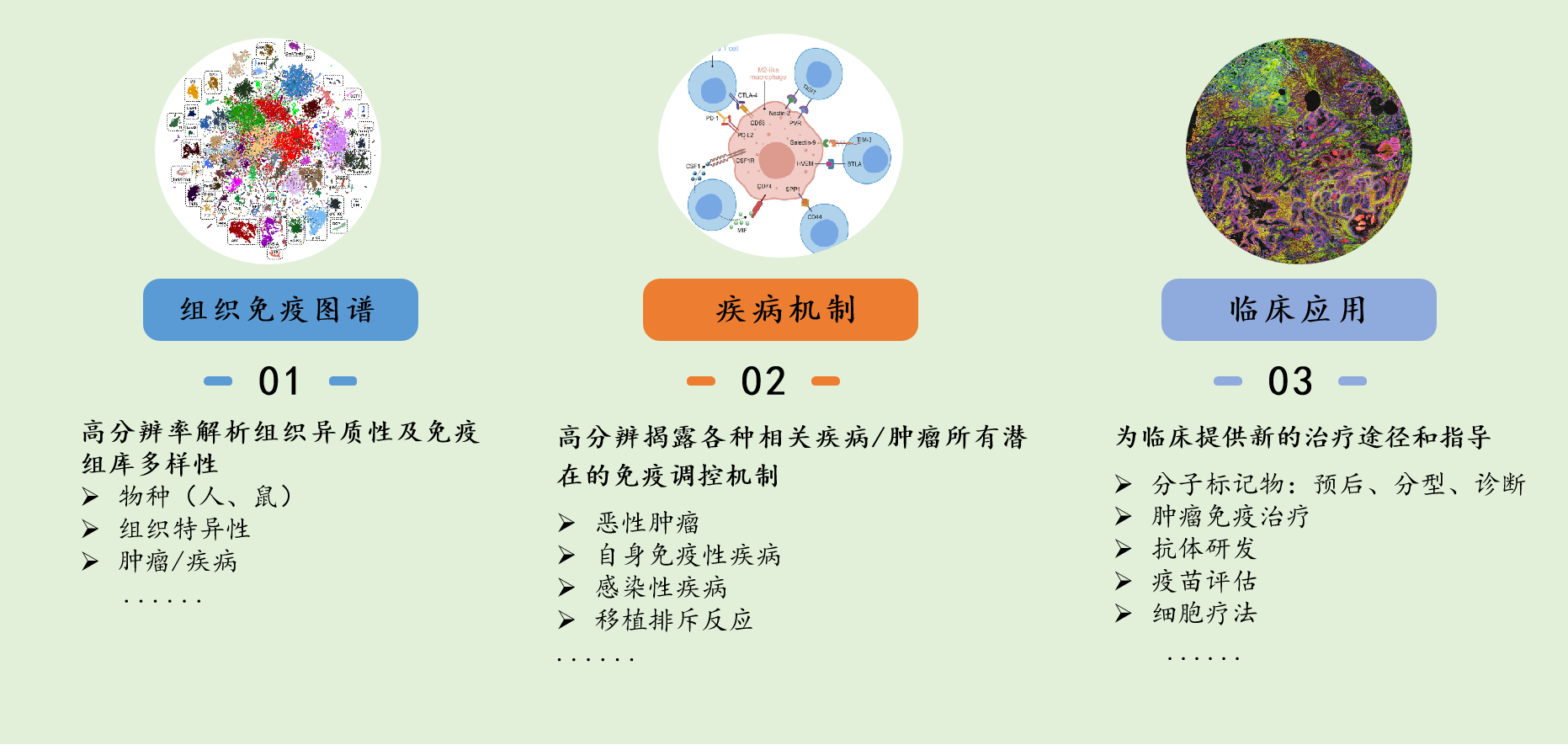 2)利用單細(xì)胞免疫組庫技術(shù),理解腫瘤與免疫的相互作用,尋找惡性腫瘤免疫治療的潛在靶點(diǎn);揭示移植體抗宿主病背后的生物學(xué)機(jī)制,為免疫調(diào)節(jié)治療提供潛在方向;破譯錯(cuò)誤導(dǎo)向免疫應(yīng)答的機(jī)制,解析免疫耐受機(jī)制與免疫應(yīng)答動(dòng)態(tài)調(diào)節(jié)之間的復(fù)雜相互作用;