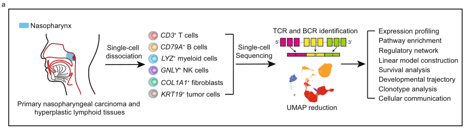 樣本設(shè)計(jì):11例鼻咽癌患者的腫瘤樣本和3例非惡性鼻咽淋巴增生的樣本,進(jìn)行scRNA+scTCR+scBCR測序。
