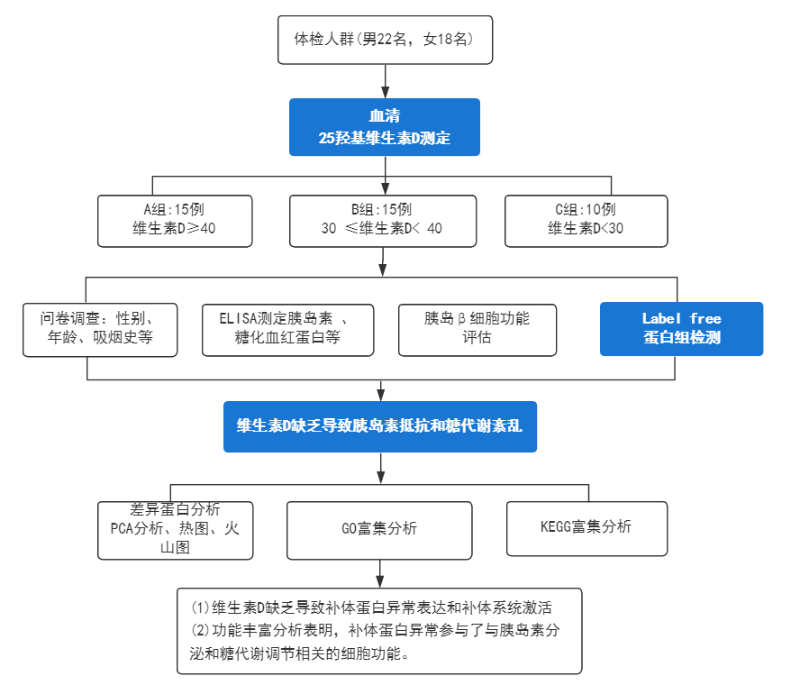 在該研究中,作者應(yīng)用高通量非靶向蛋白質(zhì)組學(xué)技術(shù),根據(jù)維生素D水平,對不同空腹血糖狀態(tài)下的體檢人群進(jìn)行分組,探討維生素D缺乏對人體補(bǔ)體系統(tǒng)激活的可能機(jī)制。為蛋白質(zhì)組學(xué)在疾病研究中的應(yīng)用提供了一個很好的案例。