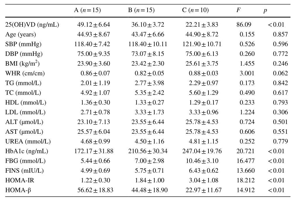 表1顯示了三組人體樣本的一般信息。比較了三組的一般數(shù)據(jù),發(fā)現(xiàn)三組之間在年齡、SBP、DBP、BMI、WHR、TC、TG、HDL、LDL、ALT、AST和尿素方面沒有顯著差異(p>0.05)。隨著維生素D含量的降低,HbA1c、Fbg、FINS和HOMA-IR水平升高,而HOMA-β水平則相反。這些結(jié)果表明,維生素D缺乏導(dǎo)致血糖水平升高和胰島素抵抗。