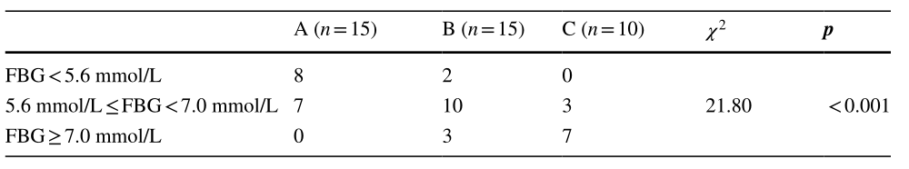 為了進(jìn)一步了解維生素D缺乏對葡萄糖代謝的影響,根據(jù)空腹血糖值對每組樣本進(jìn)行細(xì)分,進(jìn)行亞組分析。如表2所示,A組有8例空腹血糖<5.6mmoL/L,7例空腹血糖<≤7.0mmoL/L。B組2例Fbg<5.6mmoL/L,10例Fbg<5.6mmoL/L,3例Fbg≥7.0mmoL/L,C組3例Fbg<Fbg≤7.0mmoL/L,7例Fbg≥7.0mmoL/L,表明維生素D缺乏可導(dǎo)致高血糖和糖代謝異常。