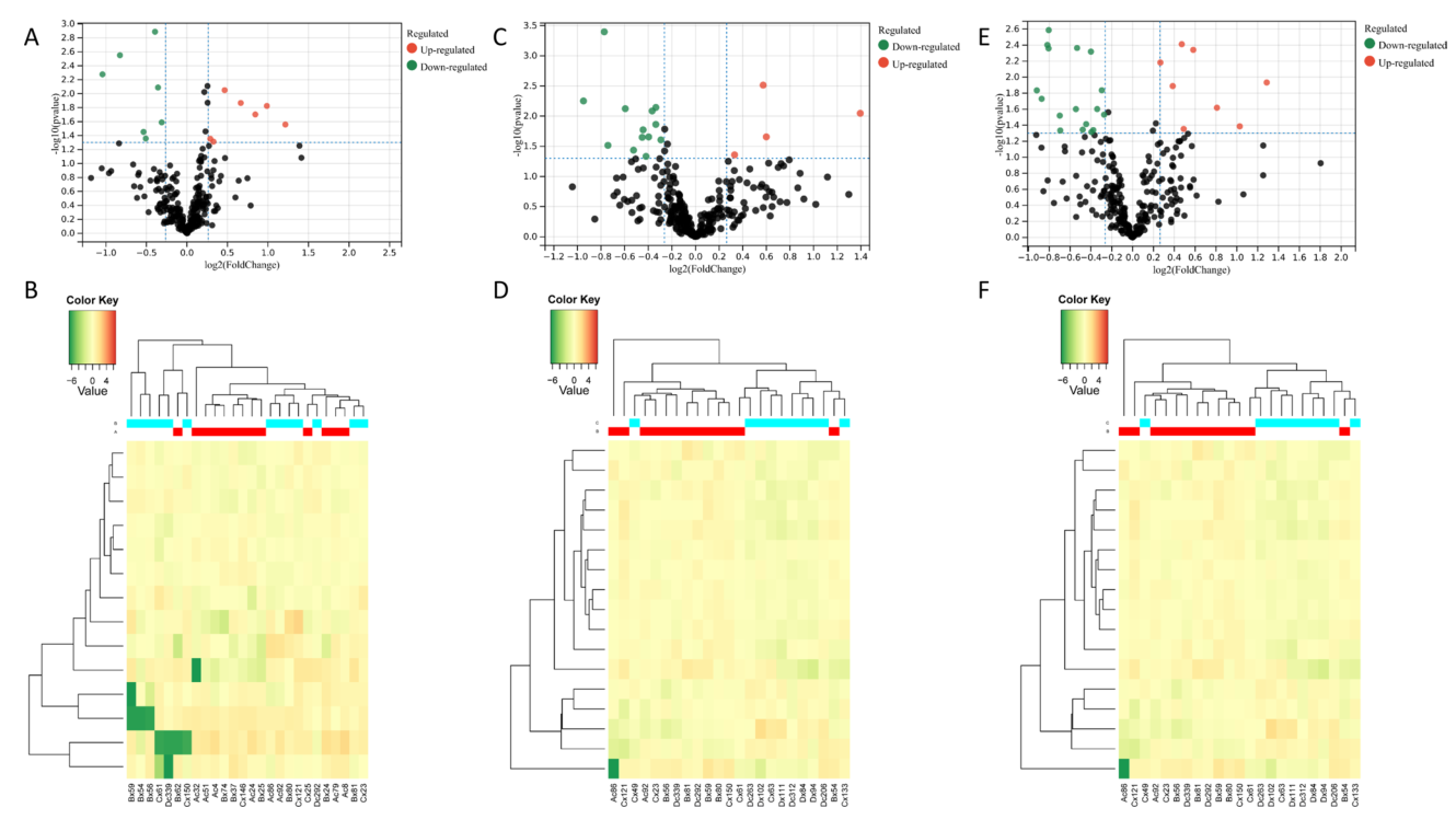 對三組蛋白質(zhì)樣本進(jìn)行了PCA分析(圖1)。蛋白質(zhì)組差異分析用于分析維生素缺乏對補(bǔ)體差異蛋白的影響。如火山圖(A?vs B)所示,隨著維生素D含量的降低,7種蛋白質(zhì)的表達(dá)水平上調(diào),7種蛋白質(zhì)的表達(dá)水平下調(diào)(圖2A),如補(bǔ)體因子B(CFB)、原肌球蛋白α-4鏈(TPM4)和可誘導(dǎo)共刺激分子配體(ICOSL)。A組和B組熱圖分析結(jié)果顯示兩組之間有很好的分離(圖2B)。