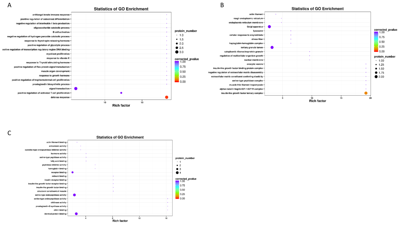 為了進(jìn)一步探索差異蛋白的潛在功能,我們進(jìn)行了GO分析。GO功能分析顯示,A組和B組之間差異表達(dá)的蛋白質(zhì)主要與“胰島素受體結(jié)合”、“防御反應(yīng)”、“積極調(diào)節(jié)活化的T細(xì)胞增殖”和“細(xì)胞對淀粉樣β蛋白的反應(yīng)”有關(guān)(圖3)。與C組相比,B組與C組差異表達(dá)的蛋白質(zhì)主要集中在“活化T細(xì)胞增殖的正向調(diào)節(jié)”、“胰島素樣生長因子結(jié)合蛋白復(fù)合體”和“維生素D結(jié)合”(圖4,見原文)。與C組相比,A組差異表達(dá)的蛋白質(zhì)主要集中在“防御反應(yīng)”、“免疫突觸”和“胰島素樣生長因子結(jié)合”(圖5,見原文)。這些結(jié)果表明,差異蛋白廣泛參與免疫功能和胰島素分泌。