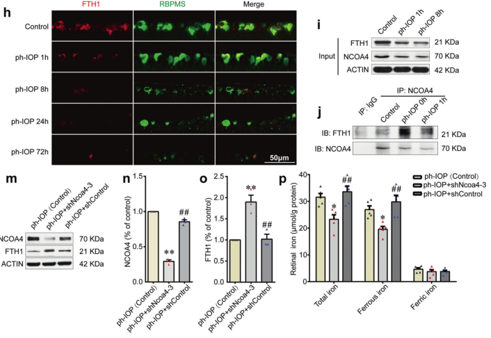 鐵蛋白(Ferritin)是一種廣泛存在的儲(chǔ)鐵蛋白,在 ph-IOP 損傷后1小時(shí),F(xiàn)TH1(Ferritin亞基)的水平急劇下降(圖2h),這與 ph-IOP 損傷后早期的鐵積累一致;鐵自噬(ferritinophagy)是一種調(diào)節(jié)細(xì)胞內(nèi)鐵代謝的選擇性自噬,檢測(cè)視網(wǎng)膜內(nèi)源性NCOA4(鐵自噬關(guān)鍵調(diào)節(jié)蛋白)蛋白水平發(fā)現(xiàn),pH-IOP 損傷后NCOA4與 FTH1之間的內(nèi)源性相互作用增強(qiáng)(圖2i, j);敲降Ncoa4后增加了視網(wǎng)膜 FTH1水平(圖2m-o),并伴隨著 ph-IOP 損傷后視網(wǎng)膜中二價(jià)鐵離子水平的降低(圖2p)。
