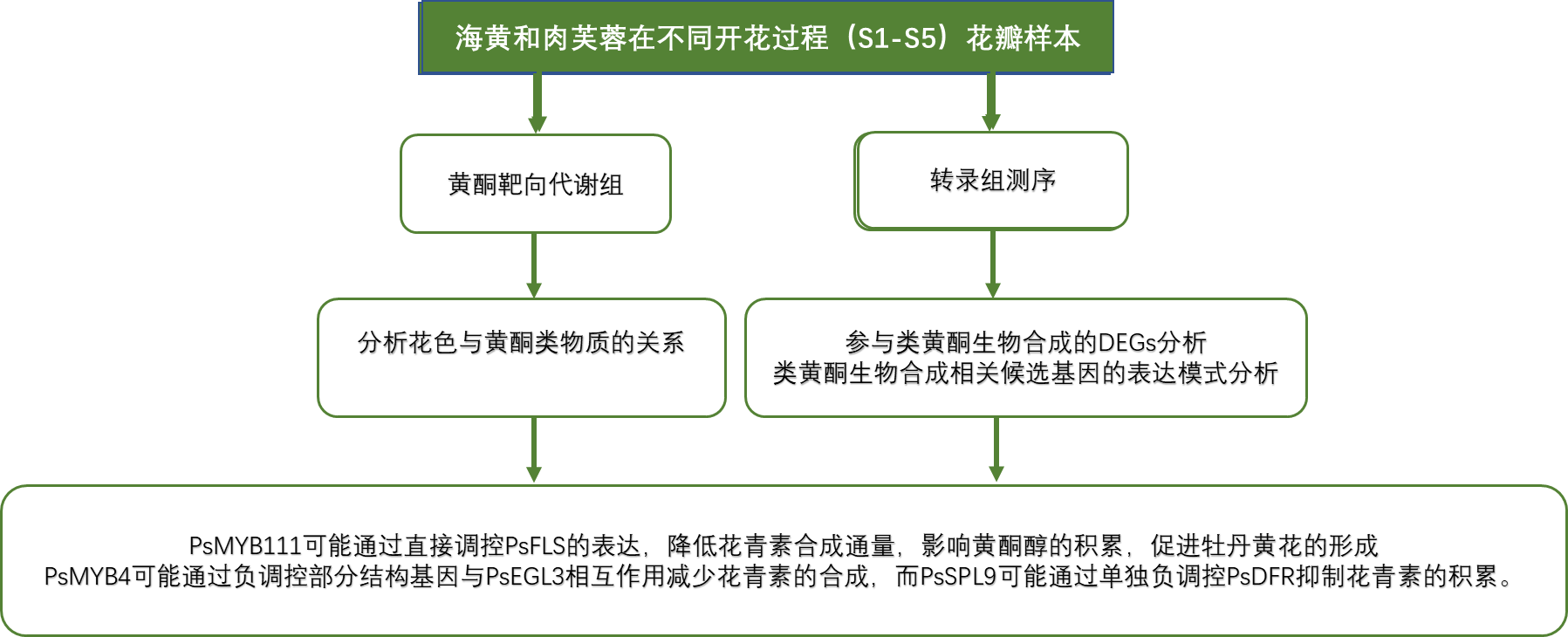 TF分析顯示調(diào)節(jié)黃酮類生物合成的TF基因都在具有黃色花的“海黃”品種中上調(diào),MYB和bHLH是調(diào)節(jié)植物黃酮類生物合成的關(guān)鍵轉(zhuǎn)錄因子TFs。該研究鑒定了幾個差異表達的MYB和bHLH轉(zhuǎn)錄因子,每一個都與牡丹黃酮類的產(chǎn)生有關(guān)。其中,PsMYB4被鑒定為具有bHLH相互作用位點的負黃酮類調(diào)節(jié)劑,這意味著它們可能形成一個復(fù)雜的負調(diào)控網(wǎng)絡(luò)。研究發(fā)現(xiàn)PsMYB111通過單獨調(diào)節(jié)PsFLS促進黃酮醇的積累。此外,PsMYB4和PsEGL3可能形成復(fù)合物負調(diào)控部分結(jié)構(gòu)基因,而PsSPL9可能單獨負調(diào)控PsDFR,抑制花青素的產(chǎn)生,降低藍色著色。