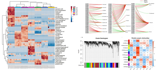 該研究對中國7個地區(qū)突尼斯石榴的代謝組和轉(zhuǎn)錄組、風(fēng)味相關(guān)屬性和揮發(fā)性化合物進行了研究。7個不同種植區(qū)的石榴,糖、有機酸和維生素c含量存在顯著差異。所有樣品共鑒定了40種揮發(fā)性化合物,其中13種揮發(fā)性化合物。所有樣品中有4種化合物含量較高,包括1-己醇、(Z)-3-己烯醇、α-松果醇和2,4-二叔丁基苯酚,是影響石榴香氣品質(zhì)的主要貢獻因素。所有樣品的5個差異積累代謝物,包括棕櫚酸、辛酸、月桂酸、癸酸和肉豆蔻酸,在所有樣品的脂肪酸生物合成中均顯著富集。WGCNA分析結(jié)果表明42個候選風(fēng)味相關(guān)差異表達基因和9個轉(zhuǎn)錄因子主要位于3個關(guān)鍵模塊中。己烷酸是一種重要的代謝物,與38個差異表達基因顯著相關(guān)。本研究構(gòu)建了復(fù)雜的調(diào)控網(wǎng)絡(luò),以確定調(diào)控石榴中揮發(fā)性化合物代謝的結(jié)構(gòu)基因和轉(zhuǎn)錄因子,發(fā)現(xiàn)bZIP56、bZIP56、bZIP20、WRKY24和bHLH9在石榴果皮的風(fēng)味代謝調(diào)控中起重要作用。