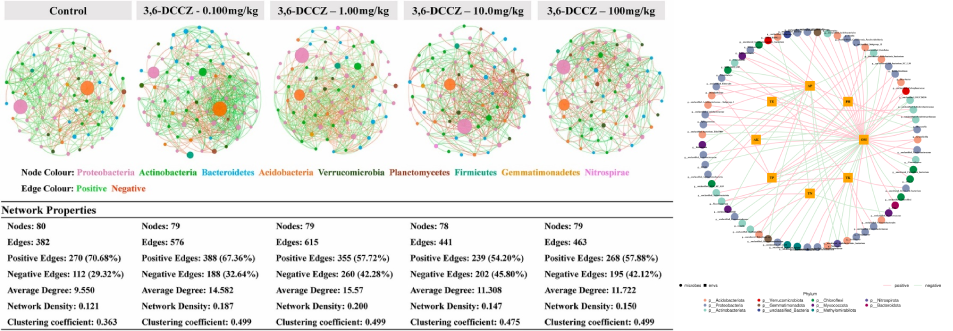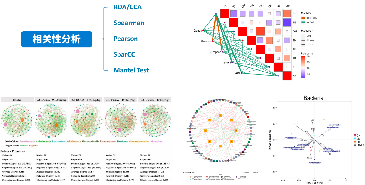 相關性網絡分析:網絡圖是相關性分析的一種表現(xiàn)形式,根據各個物種在各個樣品中的豐度以及變化情況,進行斯皮爾曼(Spearman )秩相關分析并篩選相應條件下的數據構建相關性網絡?;诰W絡圖的分析,可以獲得物種在環(huán)境樣本中的共存關系,得到物種在同一環(huán)境下的相互作用的情況及重要的模式信息,進一步解釋樣本間表型差異的形成機制。