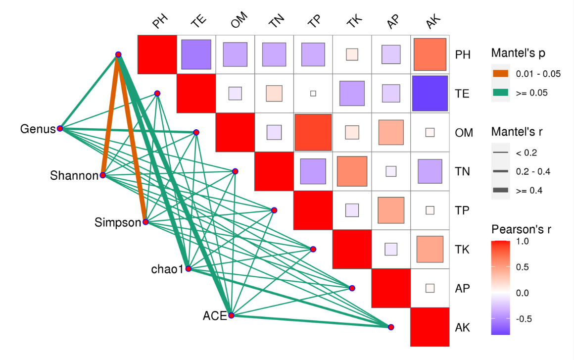Mantel Test分析:Mantel test 是檢驗兩個矩陣相關關系的非參數統(tǒng)計方法,多用在生態(tài)學上,用來檢驗群落距離矩陣(如 Bray-Curtis distance matrix)和環(huán)境變量距離矩陣(即環(huán)境因子指標)之間的相關性。其可以得到特征與環(huán)境因子之間的mantel test的r值和p值。