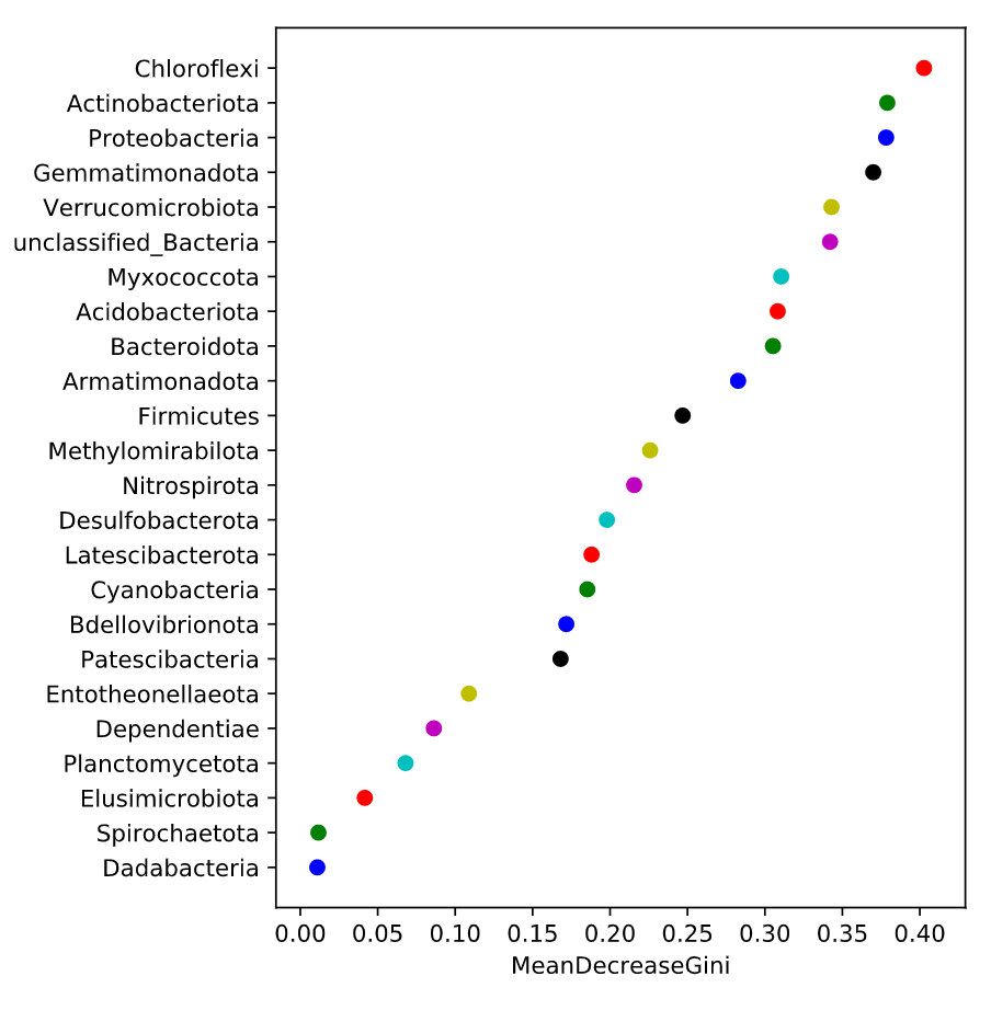 隨機森林分析:Random forest 分析,隨機森林指的是利用多棵樹對樣本進行訓練并預測的一種分類器,是機器學習的一種。利用隨機森林分析可以幫我們找到數據中重要的特征:在微生物組中就是哪些微生物組成可以作為特征進行各種預測;另外,隨機森林可以利用這些重要特征構建模型用于分類預測(分類變量)或者回歸預測(數值型變量);隨機森林分析建議分組內樣品至少30個以上,樣品數太少影響準確性。 隨機森林分析,一般將數據劃分為訓練數據集(train data)和測試數據集(test or validate data),訓練數據集用于構建預測模型,測試集用于查看模型的準確性。