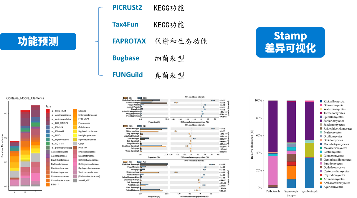 PICRUSt 2 將特征序列(16S rRNA)與微生物基因組數據庫(IMG,Integrated Microbial Genomes)參考序列對齊(aliign)構建進化樹,找到特征序列的“最近物種”,并根據已知物種的基因種類和豐度信息預測未知物種的基因信息,從而結合基因的KEGG通路信息預測整個群落的通路情況。通過組間差異分析,得到在組間具有顯著差異的功能,最后利用Stamp對結果進行差異可視化。