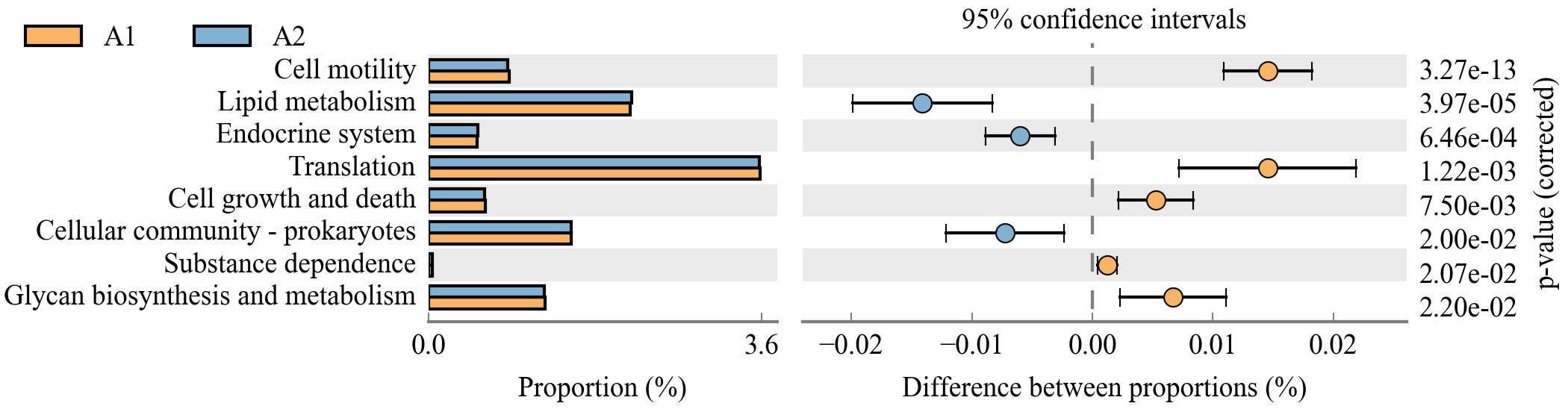 該分析可以對兩組或多組樣品的物種、基因或者功能進行顯著性差異分析,并對 p值進行FDR校正。