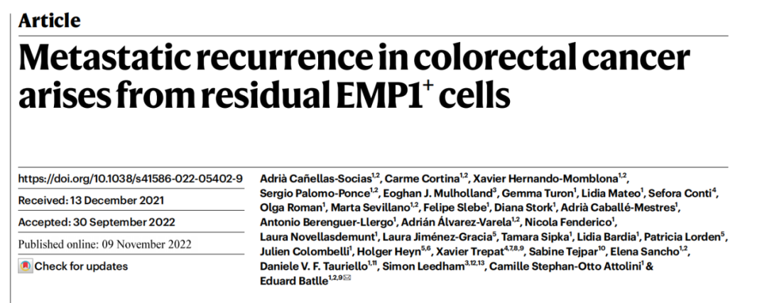 文章:Metastatic recurrence in colorectal cancer arises from residual EMP1+ cells