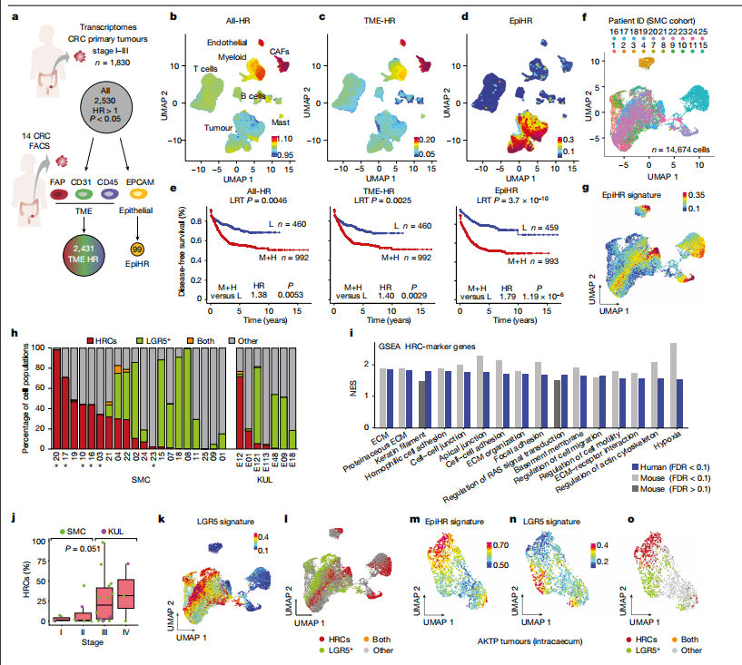 該團隊通過單細胞轉錄組測序(scRNA-seq)手段,首先對CRC患者樣本進行數(shù)據(jù)分析,發(fā)現(xiàn)大多數(shù)不良預后基因是由一群獨特的腫瘤細胞(包括:CAFs、內皮細胞以及較小程度上髓系細胞)表達的,該團隊將其命名為高復發(fā)細胞(high-relapsecells,HRCs)。